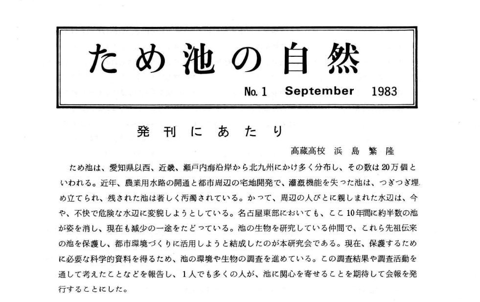 ・1983年3月、「名古屋ため池の自然研究会」と名称変更し、会誌「ため池の自然」第1号を 刊行。